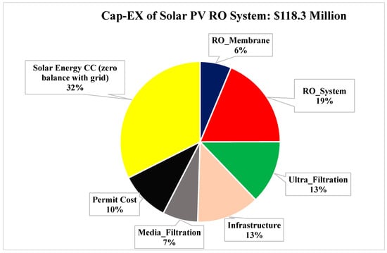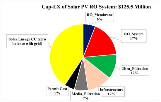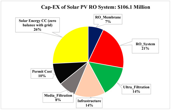 In the second case, we assume that the RO system cost may have decreased 2.5% per year instead of the 1% assumed in the baseline case, while Solar PV cost, permit cost, and RO energy consumption are the same as the baseline case. The cap-ex value and its distribution among system components are shown in Figure 8.