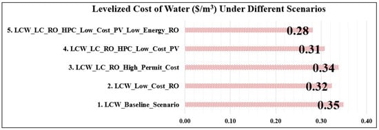 Solar PV energy has shown rapid technological improvement and a large decrease in costs for modules and other system components as discussed above. A 25% cost decrease compared to the baseline case is assumed here. This assumption may have actually been achieved in current solar PV projects. The results in Figure 10 indicate that decreasing solar PV costs will greatly contribute to lower cap-ex values for solar-PV-powered RO desalination projects. The reason is clear, as solar PV was comprising the largest share in cap-ex for the previous cases.