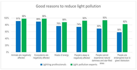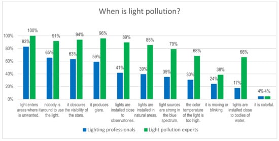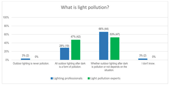 - Regarding the problem’s definition, we expect lighting professionals to argue that it depends on the situation whether light is pollution, or even to reject the notion that light can be pollution altogether. In terms of the problem’s dimensions, they will probably be more concerned with reducing energy consumption and improving humans’ visual comfort (full light spectrum, no glare) and well-being than with protecting natural darkness and star-filled skies or reducing potential negative effects on flora and fauna.