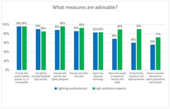 - In terms of the problem’s solutions, there seems to be a widely-shared consensus in the light pollution community that systemic change is necessary. We therefore assume that light pollution experts recommend more sustainable technology, better education and information, as well as better technical guidance, lighting standards and stricter regulations.