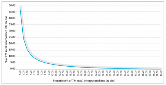 The experimental trials were realized by replacing FM (which, in the status quo scenario, is equal to 50% of the whole formula) with TM meal as the feed basis in five increasing levels: 5%, 10%, 15%, 25%, and 50%, respectively. The FCR in the simulations was decreased based on the progression reported in Gasco et al. [17] and was applied at a starting point of 2.00 in the status quo scenario (see Table 1).