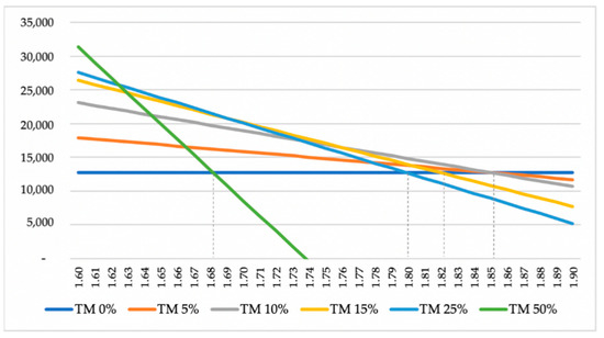 Figure 2 shows how the profits—calculated as the difference between revenues and total costs —vary by the increase in the meal prices for each scenario considered. In other words, it shows the feeding price that makes the choice indifferent (from a merely economic viewpoint) between the TM0% scenario and the other five scenarios, respectively.