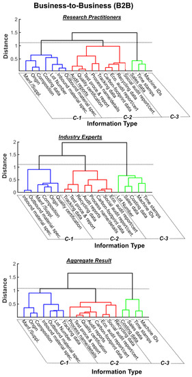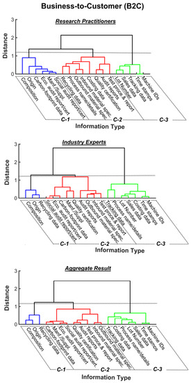 After ensuring a consensus and stability in the responses, mean values from Round 2 were clustered through hierarchical clustering, and the obtained dendrogram was optimized through an optimal leaf ordering algorithm. The obtained dendrogram, as shown in Figure 4; Figure 5, represents clustering of traceability information at the B2C and B2B levels such that the elements in cluster one have the highest rank (C-1: most important information), followed by cluster two (C-2: important information) and cluster three (C-3: less important information).