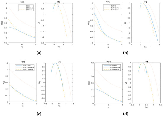 The Hurst exponent and multifractal spectrum of the index daily returns: (a) The first panel contains the Hurst exponent and multifractal spectrum of SSE. (b) The second panel contains the Hurst exponent and multifractal spectrum of SZSE. (c) The third panel contains the Hurst exponent and multifractal spectrum of SHSE-SZSE300. (d) The fourth panel contains the Hurst exponent and multifractal spectrum of SHSE- CSI500. (H(q), hq, and Dq denote order value, q-order Hurst exponent, singularity strength, and singularity spectrum, respectively).