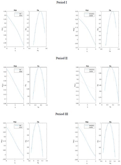 Figure 6 shows the Hurst exponents and the multifractal spectra of SSE, SZSE, SHSE-SZSE300, and CSI500 index daily return series for three sub-samples: Period I, II, and III. For each period, the solid line represents the SSE and SHSE-SZSE300 index, respectively. The dashed line represents the SZSE and CSI500 index, respectively.