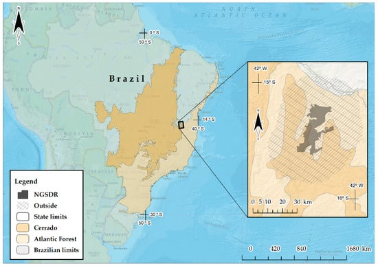 In order to broaden the debate on the creation of PAs, this article provides an approach to the actual effectiveness of PAs in a critical area for biodiversity conservation due to its high biodiversity and strong anthropogenic pressure: Thus it has great importance worldwide [23]. The objective of this study was to evaluate the effectiveness of the arguments used in the creation of PAs using the Nascente Geraizeiras Sustainable Development Reserve (NGSDR) as a case study. Therefore, we analyzed changes in the landscape over the last 30 years, using geographic information systems (GIS), remote sensing data (RS), and landscape ecology indexes. This case study was selected because it is part of the only two areas that are hotspots for the conservation of global biodiversity in Brazil, the Atlantic Forest, and Cerrado.