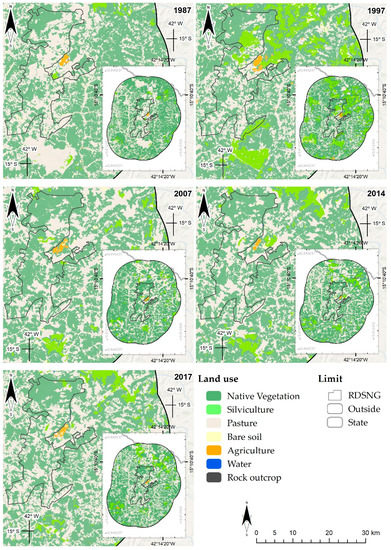 Evolution of land use and occupation of the NGSDR and its surroundings throughout the years, from 1987 to 2017.