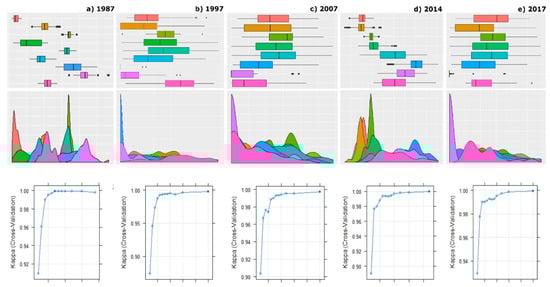 The general precision of the classifications averaged 99% from 1987 to 2017. The kappa index for the years 1987 TM, 1997 TM, 2007 TM, 2014 OLI, and 2017 OLI were 98.5%, 98%, 99%, 99.6%, and 99.7%, respectively (Figure 3). Accuracy ratings by grade ranged from 86% to 1% (Figure 3).
