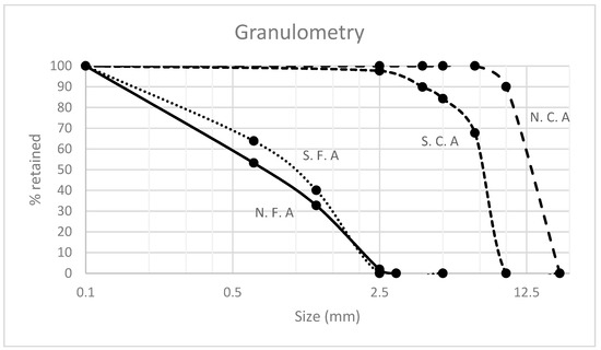 Additionally, a granulometric analysis of each type of aggregate (i.e., NFA, NCA, SFA, and SCA) was carried out, as reflected in Figure 1. ACBFS was sieved at 2.5 mm. SCA is the fraction with a size higher than 2.5 mm and SFA is the fraction lower than 2.5 mm. As can be seen, the slag coarse aggregate (SCA) has a grading distribution that is slightly smaller than the natural coarse aggregate (NCA). On the other hand, the grading distribution of the fine slag (i.e., SFA) is similar to the natural fine aggregate (NFA). This means that the range of particle size is narrower in the mixes (Table 1) where the air-cooled blast furnace slag (i.e., SFA and SCA) replaces natural aggregates (i.e., NFA and NCA).