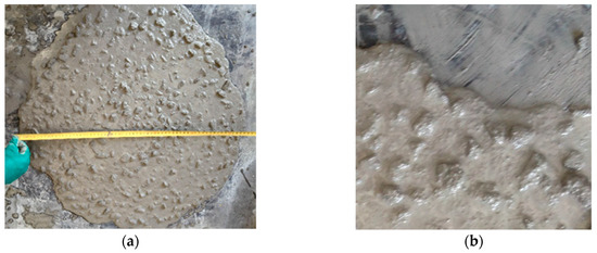 The flow table test was carried out for each mixture to determine the self-compacting properties and the consistency of fresh concrete, in accordance with the European standard EN 12350-5:2009 [25]. The time until reaching the spread diameter was less than a minute and the diameters of the final shape were 70 centimetres (the longest one) and 62 centimetres (the shortest one). Both of them are perpendicular to each other. No signs of segregation were observed for any mixture. Figure 4 provides an example of what can be seen for mix II. The displacement of the aggregates happened in the directions, and they moved as much as the cement paste, as can be seen in Figure 4.