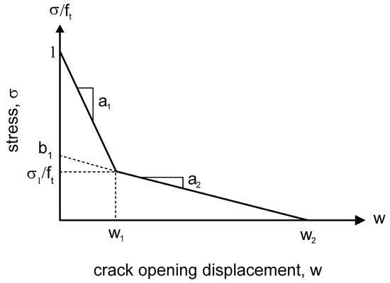 The bilinear tension softening diagrams of each specimen tested were calculated from the three-point bending test curves recorded. This diagram is an important fracture property, especially when a numerical analysis of the fracture behaviour of concrete is needed, since it could model the fracture mechanism of material [44]. In this work, it has used an inverse analysis method that is based on the non-linear hinge model described in [14,45,46] to determine the parameters that defines the bilinear tension softening diagram (see Figure 5). It is worth noting that a qualitative analysis of the influence of the microstructure in the fracture behaviour of concrete can be completed from their corresponding bilinear softening diagrams, as was carried out in other authors [14,15,47,48]. The first steep linear branch of the softening diagrams is mainly a consequence of the microcracking process and the second linear branch is due to the frictional dissipation processes (e.g., aggregate interlock). The determination of the bilinear softening diagrams consists of the minimization of the sum of square errors between the experimental and theoretical values of the load that were obtained for each deflection value, in accordance to the analytical expressions that are given in [49]. The optimization problem is solved in steps corresponding to the different phases of crack propagation.