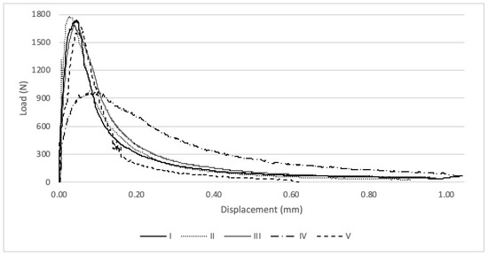 The results that were obtained from three-point bending tests are shown in curves correlating the load applied with the deflection of the specimen (Figure 6). The area that is covered under these load-deflection curves is the so-called work-of-fracture. In Figure 6, the average load-deflection curves for each mix are plotted.