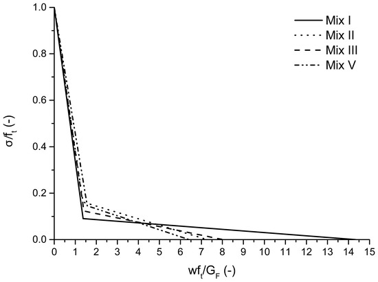 The parameters of the bilinear tension softening diagrams that were determined through the inverse method [45,46,49] described in Section 2.3.5, from the load-deflection curves, are shown in Table 7 for each mix and are plotted in Figure 7. The load-deflection curve that was obtained for mix IV (Figure 6) is very different of the curve of the rest of mixes (i.e., mix I, II, III, and V). Additionally, the non-linearity of pre-peak part of the load-deflection curve and the very horizontal tendency of the post-peak part made it impossible to find a bilinear tension softening diagram with a low enough tolerance for mix IV.