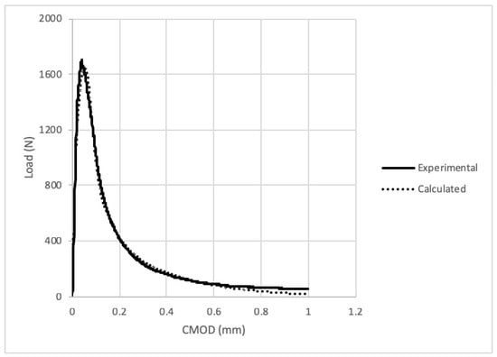 With the parameters that were obtained for bilinear tension softening diagram of mix III (Table 7), the load-crack mouth opening displacement (CMOD) curve of these mix would be the dotted line represented in Figure 8. The real curve that was obtained with the data test is also represented as a comparison.