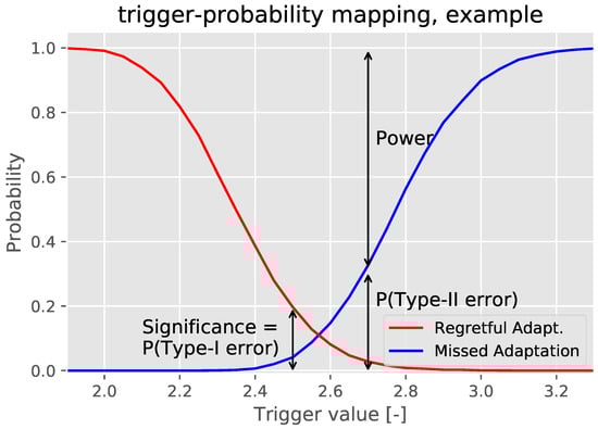 The trigger-probability mapping explores how trigger value maps to significance and to the complement of power. The trigger-probability mapping is identified by estimating significance and power, as in Equation (1), for all possible values of the trigger. Figure 1 visually displays an example of trigger-probability mapping based on an idealized case. In Figure 1 it is highlighted how significance corresponds to the probability of Type I error and power corresponds to the complement of probability of Type II error. Figure 1 shows how significance decreases, and the inverse of power increases with increasing trigger value.