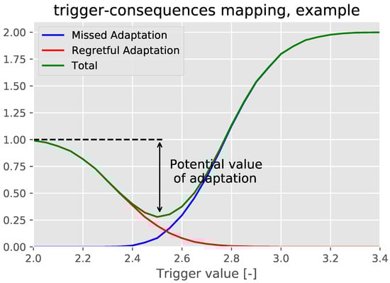 Figure 2 visually displays an example of trigger-consequence mapping, where the cost of the adaptation action is 1 M$, and the consequence of non-adaptation is 2 M$. The lowest value of trigger corresponds to a case when the adaptation action is always taken. In this case, there is no risk of missed adaptation, but high possible regret, equivalent to the full cost of the adaptation action, if the action turns out to be non-necessary. This situation can be considered as equivalent to using static robust decision-making policies [31]. The highest trigger value corresponds to a case where the action for adaptation is never taken. In this case, costs are related to consequences of missed adaptation. If a space of trigger values exists for which one can limit both consequences of regretful action and missed adaptation, then adaptive policies can offer a potential benefit.