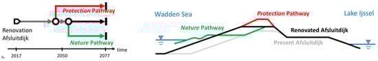 (Left) Adaptive pathways map for the renovated Afsluitdijk, including Protection Pathway (red), Zero Pathway (black), and Nature Pathway (green). (Right) schema of dike section showing alternative pathways.