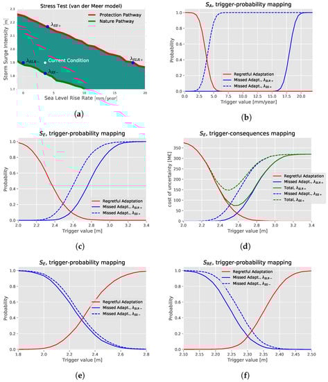 Figure 4f shows the trigger-probability mapping for signpost , evaluated at and . Figure 4f indicates the presence of a range of trigger values for which significance can be kept small and power can be kept large. This is valid for both adaptation tipping points. Nonetheless, a non-negligible risk of misclassification error is still present, even when the trigger values are properly selected. The added value of signpost , however, can be better appreciated when Plot Figure 4f is compared to the trigger-probability mapping of signpost at the same adaptation tipping points, displayed in Figure 4e. In Figure 4f the curves of missed adaptation and regretful adaptation are steeper, resulting in a higher capacity for this signpost to detect the need for adaptation.