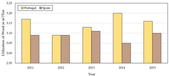 The wood consumption indicator indicates the consumed wood per ton of produced pulp. The results for this indicator for the two groups of pulp and paper companies are shown in Figure 1. From Figure 1, through the calculation of the averages of the five years, it can be concluded that the specific consumption of wood is 2% higher in Portugal than in the same sector in Spain. From this value, it is concluded that there are no significant differences in the specific use of wood between the two countries.