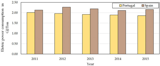 From the values shown in Figure 2, it is possible to verify that there is a downward tendency of about 7.5% in the specific consumption of energy in the sector in Portugal, and constant consumption of energy in the sector in Spain. After calculating the average of the years under study, it is also possible to verify that the indicator of energy consumption of the sector in Spain is higher than the one registered in Portugal by about 11.3%.