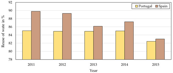 From Figure 6, it is possible to conclude that there is a constant trend in the water reuse numbers in both the Portuguese and Spanish sectors. There is one exception in the year 2015, where it is possible to observe a marked decrease in both countries. It is also possible to conclude, after the respective calculations, that the sector in Spain reuses an average of 2.66 percentage points more water than that which is reused in the sector in Portugal.