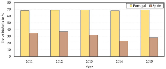 As Figure 7 shows, the biofuel utilization value of the sector in Portugal is considerably higher than in Spain, and there is a difference that exceeds 40 percentage points in some years. It is also possible to verify that the use of biofuels is constant in the sector in Portugal, and the existence of a tendency to decrease in the use of biofuels in the sector in Spain.