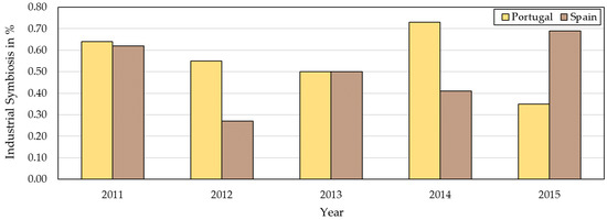 The values for this indicator are shown for both countries in Figure 8. From this figure, it can be concluded that for the sector in Portugal, the year 2015 was the year in which there was a lower symbiotic relationship, in contrast to the year 2014 that had the best result in the period between 2011 and 2015.