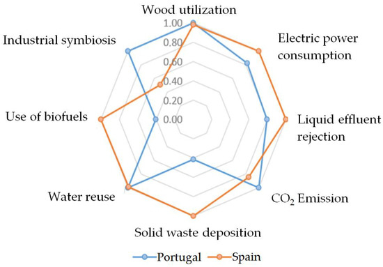 In the five years studied, when comparing to the environmental variables of the sector in Spain, the sector in Portugal stood out in the categories of: Electricity consumption, liquid effluent rejection, CO2 emissions, the use of biofuels, landfill, and industrial symbiosis. The sector in Spain had a better environmental performance in the categories of indicators related to the use of wood and water reuse.