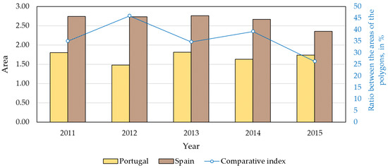 The comparative index, calculated by the ratio between the areas of the polygons of the respective countries, is also represented. Based on Figure 10, it can be concluded that the area of the polygon representative of the implementation of the sector’s circular economy in Portugal is smaller than the representative polygon of the sector in Spain during the studied period. Thus, and as can be seen from the comparative index, the pulp and paper sector in Portugal has a higher implementation of the circular economy procedures when compared with Spain.