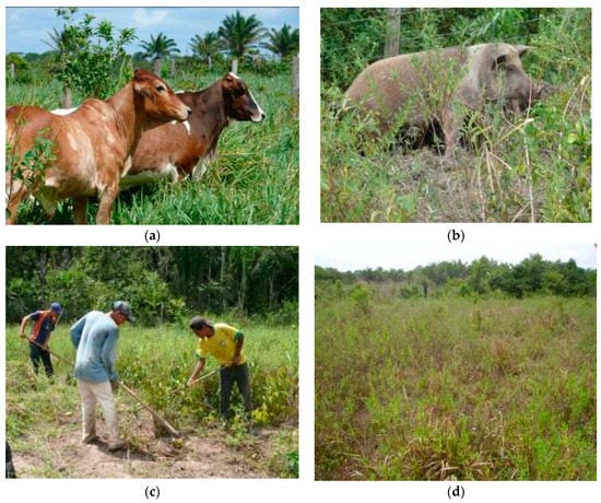 Illustration of the four treatments: (a) mixed-bred cattle (upper left photo); (b) domesticated pigs (upper right; in front of the pig there is a B. verticillata weed); (c) manual soil opening (lower left) with hoes and tolerated capoeira trees in front of the day laborers; (d) control (lower right) = biologically degraded pastures, with just typical shrub vegetation of B. verticillata and M. tenella. In the right background, an example of a capoeira can be seen.