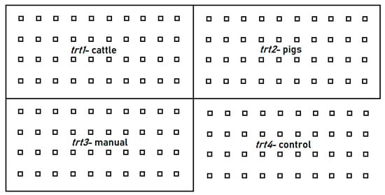 To test these hypotheses, cattle (trt1) and pig treatments (trt2) were tested against manual clearing (trt3) and control (trt4; Figure 1 and Figure 2). The experiment was replicated on three different smallholder farms (blocks) in the center of the Bragantina region, at Igarapé-Açu (1°03’ S and 47°30’ W), northeastern Pará, northern Brazil (n = 3 farms; n = 12 plots; n = 480 subplots). The region belongs to the per-humid warm low-land tropics, with a mean annual temperature between 21.0–22.3 °C and rainfall between 2000–2847 mm/year [,]. The rainy season lasts from January until June, while the dry season from July until December. The driest months October and November have less than 50 mm, respectively []. During the experimental time (August 2007 until May 2008), typical temperatures and rainfall patterns were observed. However, November, not October as usual, was the driest month in 2007 with just 2.6 mm rainfall. Therefore, December received more than the double amount of rainfall than the mean (231 mm instead of 110), and April 565 mm instead of 400 mm (mean), while the other months of the rainy season showed values minimally below the annual mean [,]. Typical soils of the region are poor Oxisols, Ultisols, and Entisols, characterized by a mean pH of 4.5, low nutrient fertility, especially in P and N, and a low cation exchange capacity [,,,].