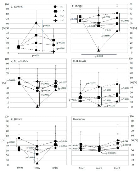 (a–f). Ground cover changes of bare soil, shrubs, B. verticillata, M. tenella, grasses, and capoeira trees of trt1 until trt4, from time1 to time3 plus standard errors (n = 8640).