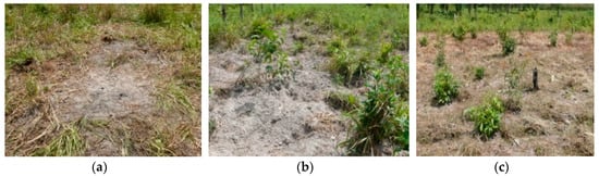 Traditionally, pastures without the possibility of re-sprouting capoeiras are defined as “biologically degraded pastures” [,]. They are ecologically characterized by chemically and physically depleted soils with low nutrient supply (especially in P and N), low cation exchange capacities, and high soil compaction [,,,]. The capoeira is almost completely uprooted and rather unpalatable native grasses, perennial herbs, herbaceous lianas, and shrubs that do not reach the biomass production of capoeira species are invading the areas [,,]. This agricultural weed vegetation formation is locally called “juquira” in the Bragantina region. The most important juquira species (weedy shrubs) on pastures in the northeastern Amazon are Borreria verticillata (L.) G. Mey. (Rubiaceae) and Myrciaria tenella (DC.) O. Berg (Myrtaceae) but also contain other taxa (Table 1c). Unfortunately, biologically degraded pastures are not easily identifiable by remote sensing (patchy distribution; a similar spectral signature as intact pastures), but first attempts suggest that 8.6% (41,572 ha) of Bragantinian agro-scapes are covered with these weedy shrubs []. On these biologically degraded pastures, the main problem is often that arriving tree seeds never reach the ground for germination but are entrapped in the dense shrubby vegetation and thick litter layers [,,,,,,,,,,,,].
