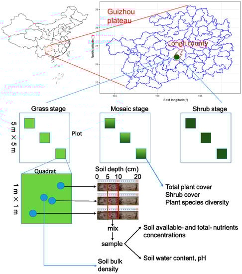 Location of the study site and the scheme of the plant survey and soil sampling in Longli county on the Guizhou plateau, southwest China.