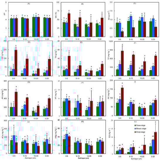 A one-way ANOVA for the soil environment, nutrient concentration, and the CS in the various SE stages is shown in Figure 2. The soil pH, ranging from 4.05 to 4.51, did not vary significantly with SE in all soil layers (p > 0.05) (Figure 2A). This indicated that SE did not produce serious soil acidification. The maximum soil WC (54.96%) and the minimum soil BD (0.58 g·cm−3) were observed in all soil layers of the shrub stage (Figure 2B,C). The soil OC, TN and AN concentration in the 0–5, 5–10, and 0–20 cm soil layers improved with SE (Figure 2D,E,G), and the soil TP concentration in all soil layers improved with SE (Figure 2F). The soil AK concentration in the 0–5 and 0–20 cm soil layer improved with SE (Figure 2I). The soil ACa and AMg concentrations did not vary significantly with SE (Figure 2J,K) (p > 0.05).