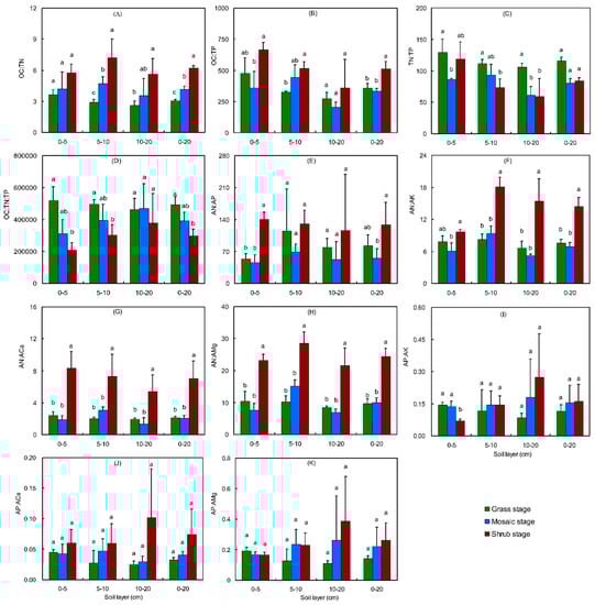 A one-way ANOVA for SNS among the SE stages is shown in Figure 3. The SNS ratios changed with SE, but only the OC:TN ratio improved with SE in all soil layers (Figure 3A). The TN:TP ratio was higher in all soil layers of the grass stage (Figure 3C), and the OC:TN:TP ratio was lower in the shrub stage in all soil layers (Figure 3D). However, the ratios of OC:TN, OC:TP, AN:AP, AN:AK, AN:ACa, AN:AMg, and AP:ACa in all soil layers were higher in the shrub stage (Figure 3A,B,E–H).