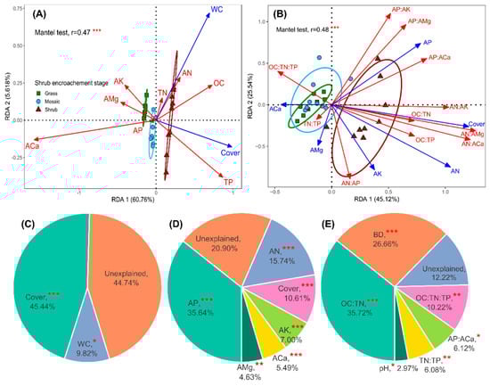 (A) The biplot of the redundancy analysis (RDA) of the soil nutrient concentration over shrub encroachment (n = 9). (B) The biplot of the RDA of soil nutrient stoichiometry over shrub encroachment (n = 9). (C) The percentages of the variation in the soil nutrient concentration explained by factors in the partial RDA (n = 9). (D) The percentages of the variation in soil nutrient stoichiometry explained by factors in the partial RDA (n = 9). (E) The percentages of the variation in soil carbon storage explained by factors in the partial RDA (n = 9). Cover represents the shrub relative cover. * p < 0.05; ** p < 0.01; *** p < 0.001.