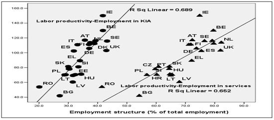Table 4). The estimated simple linear regression model for the impact of the level of employment in KIA on labor productivity in the EU countries, during the 2007–2016 period (labor productivity = 42.640 + 0.830 × employment in KIA), highlights that employment in KIA positively influenced labor productivity (β = 0.830). This model was statistically significant (