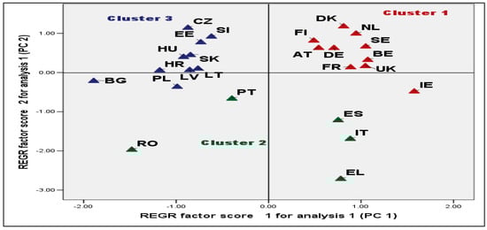 The two principal components were used in the cluster analysis to classify the EU countries. We used hierarchical cluster analysis, Ward’s method, and Euclidean distance to define the number of clusters in which the 25 countries were classified. Then, we used the k-means analysis to actually form the clusters. According to the results of the ANOVA analysis (