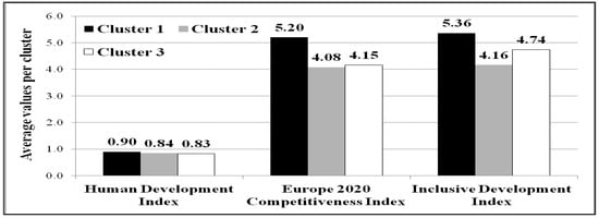 Figure 4) because, in these countries, employment in agriculture, compensation of employees, and poverty rate were higher compared with the average of this cluster. Bulgaria was in last place in EU-28 in terms of human and economic development, and labor productivity, and the next to last as regards Europe 2020 Competitiveness Index (3.75). The Czech Republic recorded, during the 2007–2016 period, the lowest in-work poverty rate in EU-28, which can be explained by the highly distributive effects of its welfare system [