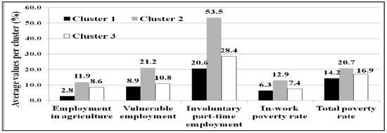 Cluster 2 included five countries (Greece, Italy, Spain, Portugal, and Romania) with the highest working poverty rate, vulnerable employment, employment in agriculture, and involuntary part-time employment (