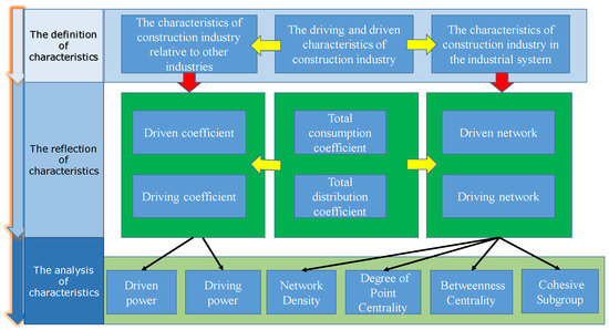 As shown in Figure 1, the framework of the methodology used in this paper mainly includes three steps: (1) The definition of the characteristics of construction industry from the driven and driving perspective. In this paper, the driven and driving characteristics are discussed from two aspects: The characteristics of construction industry relative to other industries and in the entire industrial system. (2) The reflection of the driven and driving characteristics of construction industry. First, the driven and driving coefficients are established according to the total consumption and total distribution coefficient. Second, based on the driven and driving coefficients, the driven social network and driving social network are constructed. (3) The analysis of driven and driving characteristics from two aspects: Relative to other industries and in the entire industrial system. The driven and driving coefficient are used to represent the driven and driving power to other industries. After that, the social network analysis method is used to reveal the characteristics of construction industry relative to the entire industrial system.