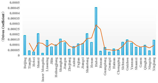 The total consumption coefficient in Table 1 provides a good understanding of the detailed information about the providers and their supply capacity for the products and services consumed by the construction industry in 30 provinces and municipalities. Although the total consumption coefficient can reflect the driven effect of the construction industry on another specific industry, it cannot express the driven effect on other industries in general. Therefore, the driven coefficient was employed, which was calculated in Section 2.2.1. The driven coefficients of the construction industry in 30 provinces are shown in Figure 3.