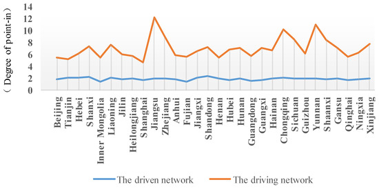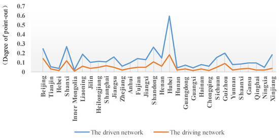 The maximum degrees of point-out centrality of the construction industry, both in the driving and driven networks, occur in the provinces of Hubei, Shanxi, and Shandong. The degree of point-out centrality reaches 0.596 and 0.181 in the driven and driving networks, respectively, which are far higher than in other provinces. The lowest degrees of point-in centrality of the construction industry in both the driving and the driven networks were found in the provinces of Guangxi, Hebei, and Inner Mongolia. The degree of point-out centrality of the construction industry in Inner Mongolia is only 0.021 and 0.009 in the driven and driving networks, respectively. Notably, the degree of point-out centrality in the provinces of Hubei, Shanxi, Shandong, Beijing, Guizhou, Liaoning, Xinjiang, Jiangsu, Sichuan, Henan, Fujian, Jiangxi, Heilongjiang, Shanghai, and Jilin (15 of 30 provinces), is more than 0.1. In other words, the degree of point-out centrality in half of the 30 provinces is less than 0.1 and in others, it is more than 0.1.