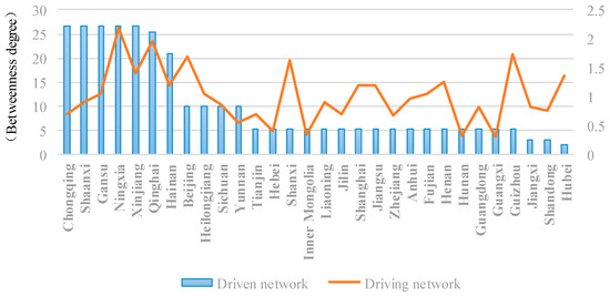 As shown in Table 6, in the driven network, the first group of provinces, including Chongqing, Shaanxi, Gansu, Ningxia, Xinjiang, Qinghai, and Hainan, was ranked by the betweenness degree of the construction industry, where the betweenness degree exceeds 20. In Chongqing, Shaanxi, Gansu, Ningxia, and Xinjiang, the betweenness degrees are 26.66. The betweenness degree was 9.903 in the second class, which includes Beijing, Heilongjiang, Sichuan, and Yunnan. The provinces of Tianjin, Hebei, Shanxi, Inner Mongolia, Liaoning, Jilin, Shanghai, Jiangsu, Zhejiang, Anhui, Fujian, Henan, Hunan, Guangdong, Guangxi, and Guizhou are in the third class with the same betweenness degree of 5.306. Jiangxi, Shandong, and Hubei are in the last class with the lowest betweenness degree of less than 3.0. In the driving network, the provinces can be divided into four classes according to the betweenness degree. The first class includes the provinces of Ningxia and Qinghai, in which the betweenness degree is around 2.0. Guizhou, Beijing, and Shanxi are in the second class, with betweenness degrees ranging from 1.6 to 1.8. The provinces of Xinjiang, Hubei, Henan, Hainan, Jiangsu, Shanghai, Fujian, Gansu, and Heilongjiang are in the third class, where the betweenness degree is more than 1.0. The other provinces are included in the last class with a betweenness degree of less than 1.0. The betweenness degree of Guangxi was the lowest of all the provinces.