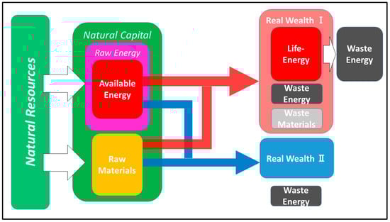 Real Wealth I consist of goods taken out of natural resources to cover the energy necessary for social life, such as food and fuel. This wealth is consumable and exerts its utility in the process of consumption (energy conversion). We acquire life energy from available energy and raw materials in natural capital and, at the same time, we emit waste energy and waste materials. The former and the latter are entirely inseparable, and the obtained life energy is also converted into waste energy.