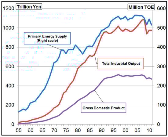 Let us survey the historical trends of Total Primary Energy Supply, Total Primary Energy Supply, and Gross Domestic Product in Japan as represented in