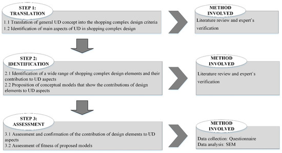 The research gaps of the current study included a lack of studies on UD translation into the shopping complex design criteria, lack of studies on significant design elements of the shopping complex, and lack of studies on the contribution of design elements to UD aspects. To fulfill these gaps, the authors used a three-step approach which is shown in Figure 1.