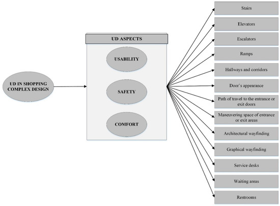 The issue of designing shopping complexes to be usable for people with various abilities and backgrounds is crucial. While several studies addressed the general concept of UD and its principles, a very limited number of studies defines the main aspects of UD in designing of shopping complexes. In addition, no study identified the contribution of shopping complex design elements to the UD aspects. In the present study, the authors translated the general concept of UD into the shopping complex design criteria and used the UD concept to propose a platform for inclusive shopping complex design and assessment. Usability, safety, and comfort were identified as the main aspects of UD in shopping complex design. The authors then proposed conceptual models based on the literature and the translation and related the design elements to each UD aspect. They then assessed the fitness of these models and assessed the contribution of each design element in the UD aspects using SEM. According to the results of SEM, service desks had the strongest relationship with usability and safety. In addition, appearance of doors had the strongest relationship with comfort.