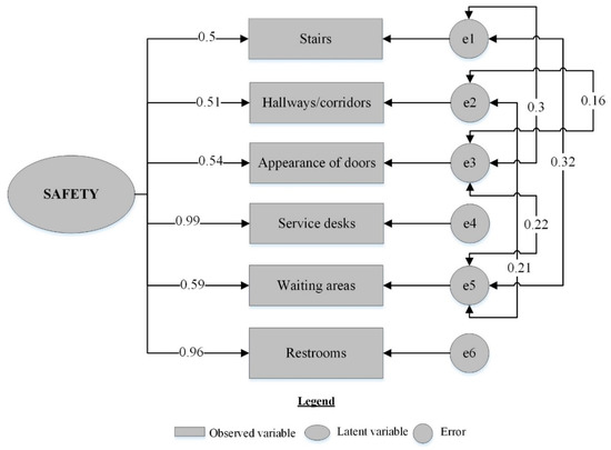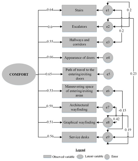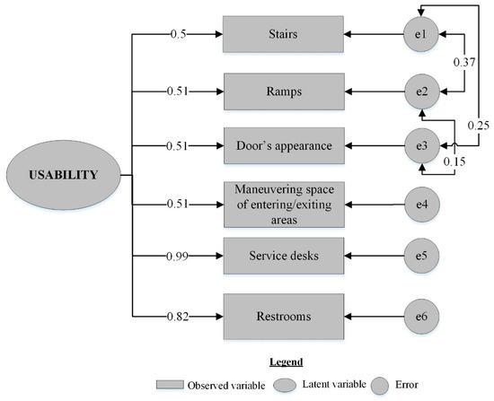 The estimated models show that the majority of the observed variables contributed to usability, comfort, and safety of the shopping complexes. Meanwhile, a number of the observed variables were dropped because of their insignificance, but this does not imply that the removed design elements did not have a contribution to the latent variables. It is worth noting that the majority of the literature is pertaining to Western countries. Nevertheless, the shoppers in Kurdistan might have different perceptions of the shopping complexes. Figure 3, Figure 4 and Figure 5 show the final constructed models for the main aspects of UD for shopping complexes. Table 3 indicates the reliability of the final constructed models for the main aspects of UD in the shopping complexes. Table 4 shows the fitting indices of the models.